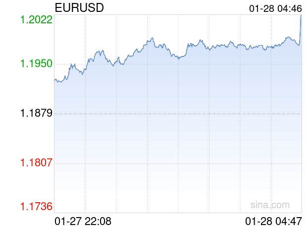 新浪外汇消息2026年01月28日,截至04时46分,外汇市场上欧元兑美元汇率突破1欧元兑换1.2012美元。涨幅为1.1196%