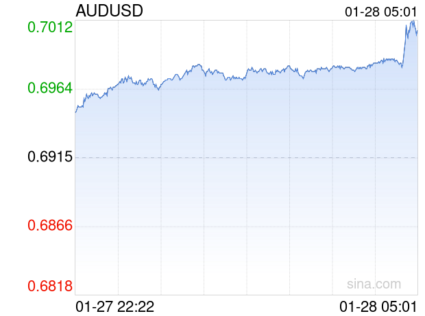 新浪外汇消息2026年01月28日,截至05时01分,外汇市场上澳元兑美元汇率突破1澳元兑换0.7004美元。涨幅为1.2871%
