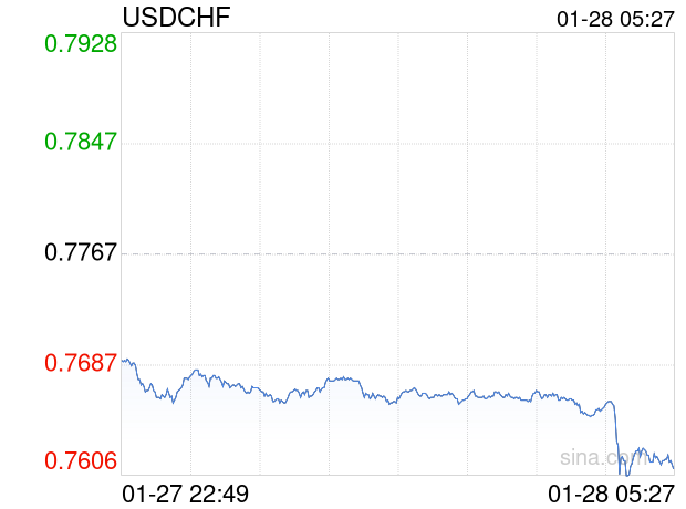 新浪外汇消息2026年01月28日,截至05时27分,外汇市场上美元兑瑞士法郎汇率跌破1美元兑换0.7611瑞士法郎。跌幅为-2.0085%