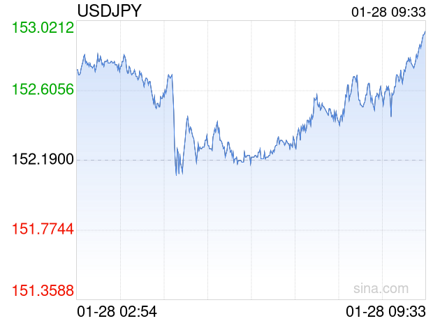 新浪外汇消息2026年01月28日,截至09时32分,外汇市场上美元兑日元汇率突破1美元兑换152.9600日元。涨幅为0.5060%