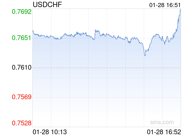 新浪外汇消息2026年01月28日,截至16时51分,外汇市场上美元兑瑞士法郎汇率突破1美元兑换0.7691瑞士法郎。涨幅为1.0644%