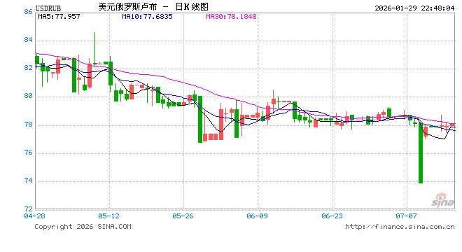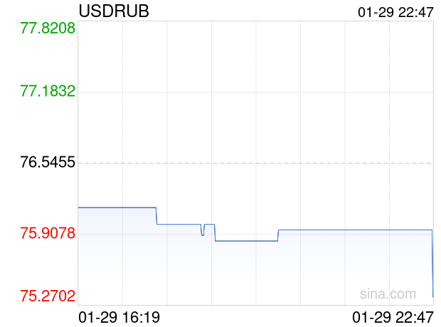 新浪外汇消息2026年01月29日,截至22时47分,外汇市场上美元兑俄罗斯卢布汇率跌破1美元兑换75.3455俄罗斯卢布。跌幅为-1.5677%