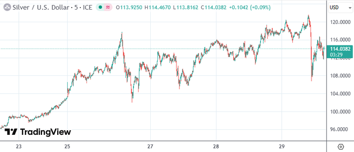 与此同时,现货银价从历史高位每盎司121.67美元跌至106.80美元,日内跌幅最大时为8.5%。截至发稿,银价反弹至每盎司114美元附近,跌幅收窄至2.3%左右。