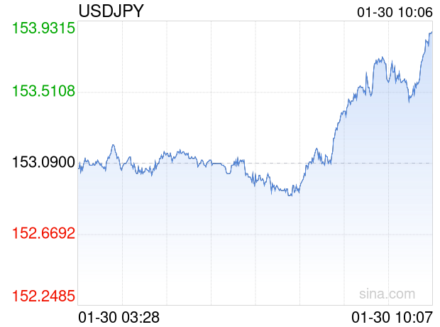 新浪外汇消息2026年01月30日,截至10时06分,外汇市场上美元兑日元汇率突破1美元兑换153.8600日元。涨幅为0.5030%