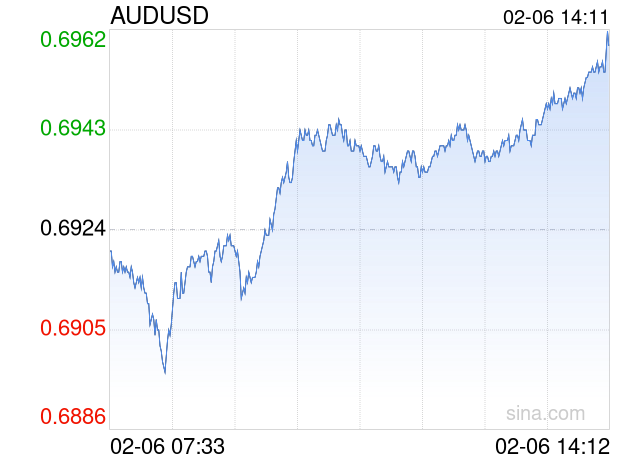 新浪外汇消息2026年02月06日,截至14时11分,外汇市场上澳元兑美元汇率突破1澳元兑换0.6961美元。涨幅为0.5344%