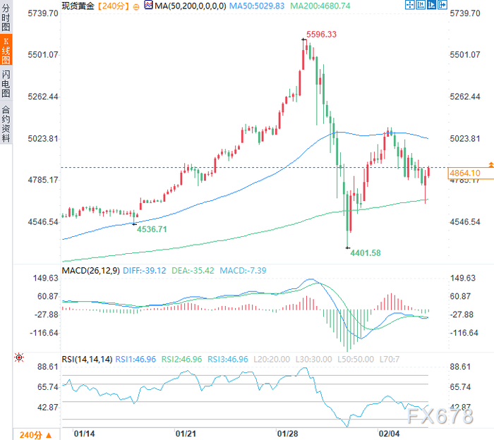 (现货黄金4小时图,来源:易汇通)北京时间14:06,现货黄金现报4878.73美元/盎司。