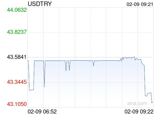 新浪外汇消息2026年02月09日,截至09时21分,外汇市场上美元兑土耳其里拉汇率跌破1美元兑换43.1440土耳其里拉。跌幅为-1.0098%