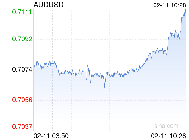新浪外汇消息2026年02月11日,截至10时28分,外汇市场上澳元兑美元汇率突破1澳元兑换0.7110美元。涨幅为0.5089%