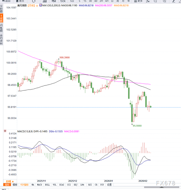 RSI指标位于52附近,中性偏多;MACD位于零轴附近,柱状图收缩,表明多空力量短线均衡。在4小时图上,DXY在96.75-96.85区间整理,形成箱体震荡结构。上方96.95-97.00为强阻力,多次试探未能突破;