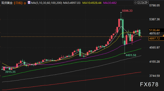 现货黄金下跌2.8%,报每盎司4938.69美元,盘中一度跌至2月6日以来最低水平。美国4月交割黄金期货收报每盎司4948.4美元,跌幅2.9%。