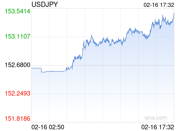 新浪外汇消息2026年02月16日,截至17时32分,外汇市场上美元兑日元汇率突破1美元兑换153.4800日元。涨幅为0.5240%