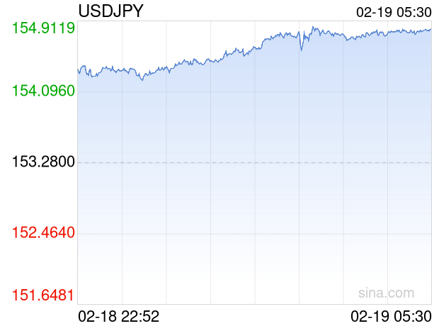 新浪外汇消息2026年02月19日,截至05时30分,外汇市场上美元兑日元汇率突破1美元兑换154.8200日元。涨幅为1.0047%
