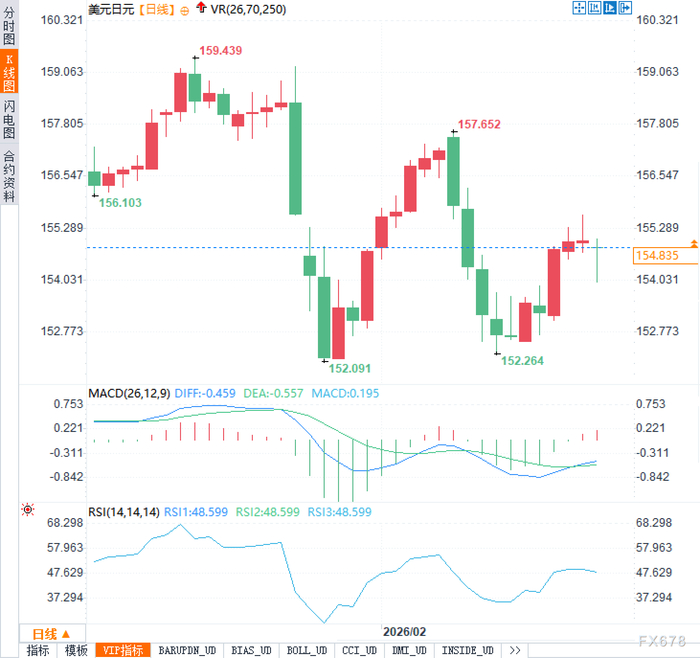 2月23日周一,美元兑日元北美时段交投154.80附近,这一价位恰好处在前期快速下挫后的修复区间,市场情绪显得颇为微妙。回顾日线形态,汇价此前曾一度上探至159.439附近的高点,但随后遭遇阻力回落,并在152.091与152.264一带构筑了阶段性的低位支撑。