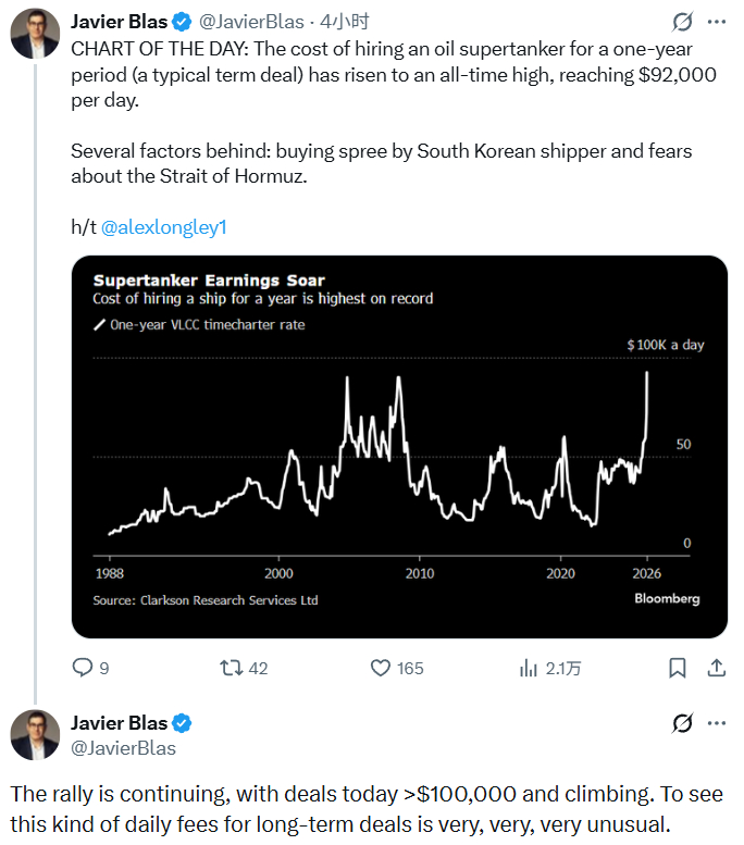北京时间周二晚间,能源领域知名作者Javier Blas在社交媒体上感叹称,现在租用VLCC的一整年期合同已经突破9万美元/日,创出历史新高。评论区里有网友指正称,现在历史新高已经变成DHT刚签下的10.5万美元/日。
