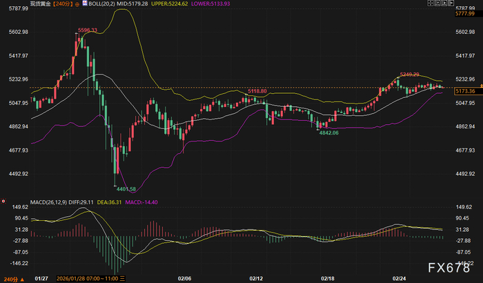 现货黄金在本轮回调至5173美元/盎司附近后获得买盘承接,240分钟K线图显示价格围绕布林带中轨(5179.27美元)展开拉锯。尽管MACD指标仍处于负值区域(柱状体-14.42),但快线DIFF已开始走平,空头动能衰减迹象明显。前期高点5596.13美元确立的调整压力正在被时间消化,而4842.06美元的关键支撑位为中期多头提供了安全垫。
