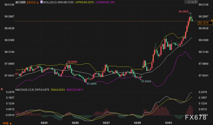 周二(3月3日)欧洲交易时段,地缘政治局势骤然升级,美国及以色列对伊朗目标发动军事打击,引发全球金融市场剧烈波动。然而,与过往地缘危机爆发时市场呈现的典型“避险模式”不同,本次各类资产的反应呈现出显著分化与结构性特征。美元指数延续强势,一举突破99关口,触及一个月以来新高。美债10年期收益率在经历短暂下探后迅速V型反弹,重新回到4.0%上方运行。这种资产价格表现的分化,揭示了当前市场交易逻辑的核心已从单纯的地缘恐慌,转向对通胀预期重估以及能源冲击结构性影响的深度定价。
