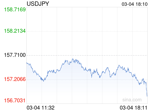 新浪外汇消息2026年03月04日,截至18时10分,外汇市场上美元兑日元汇率跌破1美元兑换156.8800日元。跌幅为-0.5263%