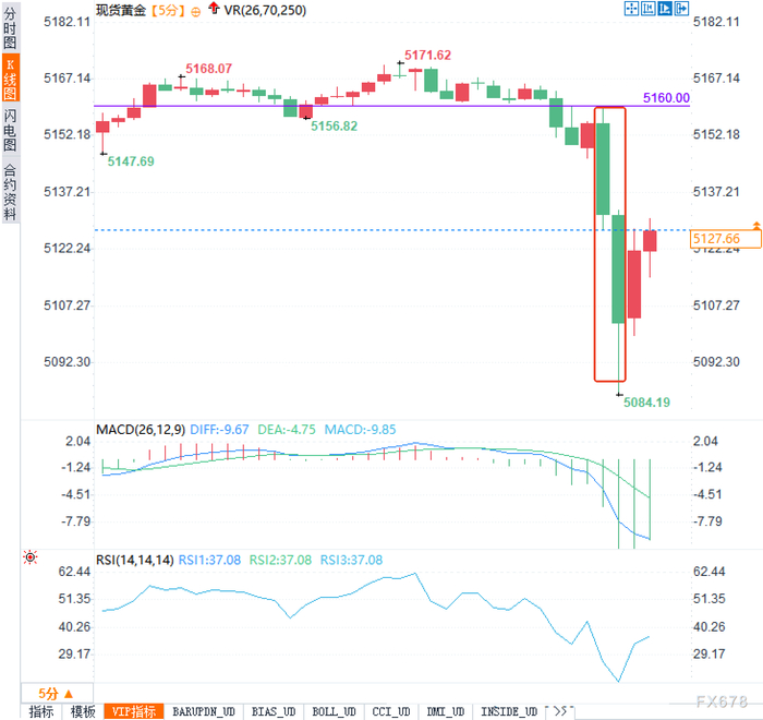 从5分钟走势图看,现货黄金在高位震荡后遭遇猛烈抛售。MACD指标显示DIFF值-9.67、DEA -4.75、MACD柱-9.85,熊市排列特征明显,短期动量持续走弱。RSI(14)读数回落至37附近,处于中性偏弱区间,尚未进入超卖但下行动能强劲。图中紫色水平线5160美元现转为阻力,成交量暗示机构参与度较高。