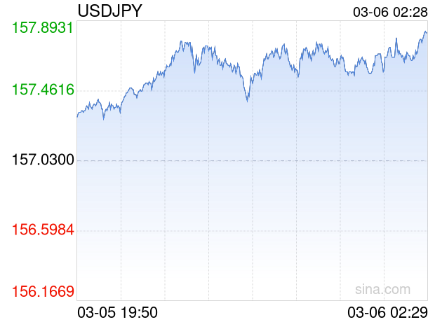 新浪外汇消息2026年03月06日,截至02时28分,外汇市场上美元兑日元汇率突破1美元兑换157.8200日元。涨幅为0.5031%