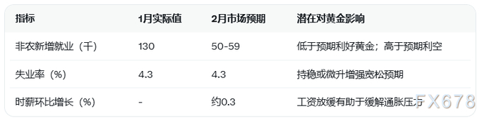 预期新增就业50,000-59,000个,远低于1月130,000个。若数据疲软,将提升降息概率、削弱美元并利好黄金;强劲数据则强化通胀叙事,进一步打压金价。失业率持稳4.3%和工资增长放缓迹象,可能放大宽松信号。