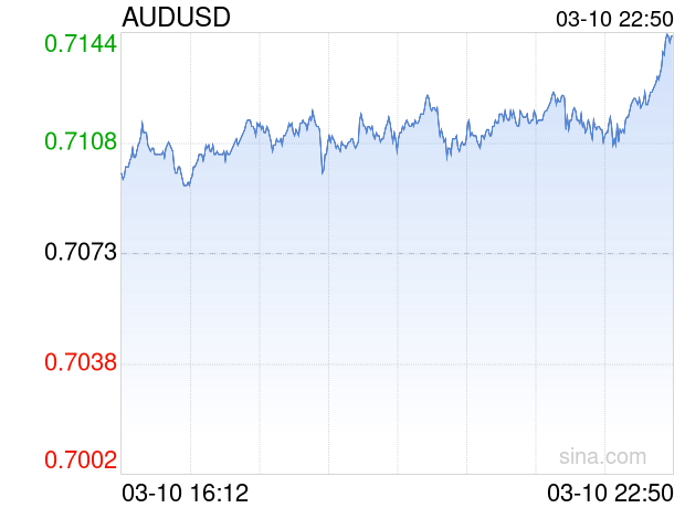 新浪外汇消息2026年03月10日,截至22时50分,外汇市场上澳元兑美元汇率突破1澳元兑换0.7144美元。涨幅为1.0038%