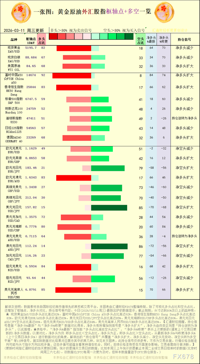 汇通财经APP讯——一张图:2026年3月11日黄金原油外汇股指“枢纽点+多空持仓信号”一览。今日(2026年3月11日周三)最新出炉的数据显示,截止刚刚,本图表中,最新处于“超买”状态(多头超过80%)的有:6 个品种,最新处于“超卖”状态(多头不足20%)的有:2 个品种。其中,多头头寸占比最高的是:富时中国A50 ☆FTSE China A50。现货黄金XAU/USD多头占比:82%,美国原油WTI OIL多头占比:68%,欧元兑美元EUR/USD多头占比:49%。这些品种较昨更的“变动信号”以及更详细的清单列表,详见汇通财经特制图表。持仓的变动信号中,净多头扩大的有:8 个,净多头减少的有:7 个,净空头扩大的有:3 个,净空头减少的有:5 个。头寸达到80%及以上的品种有:现货黄金XAU/USD多头占比高达82%。富时中国A50☆FTSE China A50多头占比高达92%。香港恒生指数HK50 Hang Seng多头占比高达83%。欧元兑澳元EUR/AUD多头占比高达83%。美元兑日元USD/JPY空头占比高达85%。美元兑瑞郎USD/CHF多头占比高达80%。澳元兑日元AUD/JPY空头占比高达86%。纽元兑美元NZD/USD多头占比高达84%。美元兑离岸人民币USD/CNH多头占比高达85%。