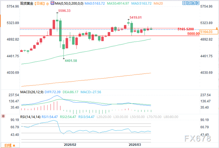 黄金日线图显示短期形成高位震荡回调格局,5,150-5,100美元为关键支撑带(50日均线附近),上方5,250-5,300美元为初步阻力;白银则更显弱势,金银比升至约60:1,暗示白银工业需求短期受高油价挤压更明显。