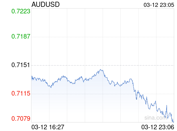 新浪外汇消息2026年03月12日,截至23时05分,外汇市场上澳元兑美元汇率跌破1澳元兑换0.7079美元。跌幅为-1.0069%