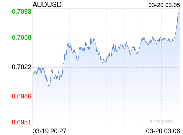新浪外汇消息2026年03月20日,截至03时05分,外汇市场上澳元兑美元汇率突破1澳元兑换0.7095美元。涨幅为1.0396%