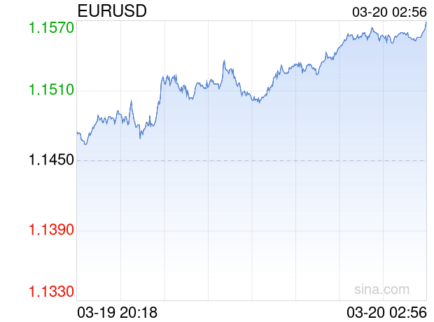 新浪外汇消息2026年03月20日,截至02时56分,外汇市场上欧元兑美元汇率突破1欧元兑换1.1569美元。涨幅为1.0393%