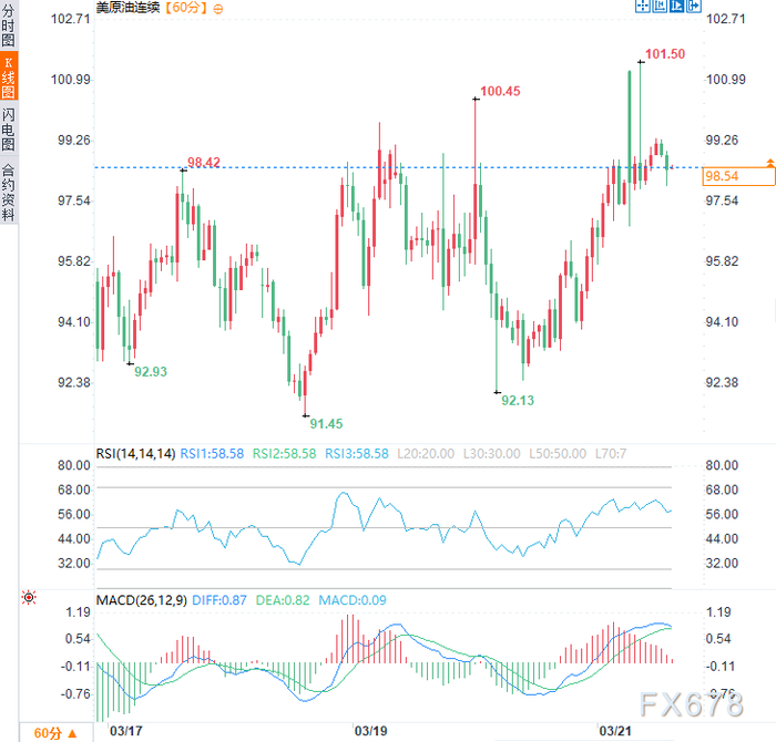 市场能源紧张情绪延续,周一(3月23日)亚欧时段,国际油价震荡走高,目前交投于99.75美元/桶,涨幅约1.5%;盘初曾一度跳涨3%至101.50美元/桶,为3月16日以来新高,随后快速回落至96.75美元/桶。