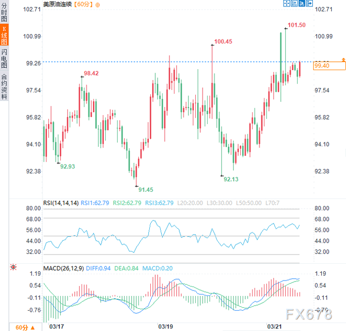 周一亚市早盘时段美原油价格剧烈震荡,一度冲高回落,盘初一度跳涨3%至101.50美元/桶,为3月16日以来新高,随后快速回落至96.75美元/桶附近,亚欧时段震荡上行,现交投于每桶100.09美元附近,日内涨幅约1.88%。