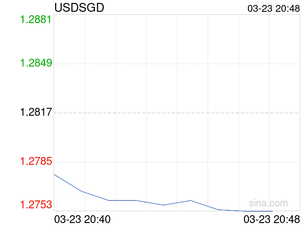 新浪外汇消息2026年03月23日,截至20时48分,外汇市场上美元兑新加坡元汇率跌破1美元兑换1.2748新加坡元。跌幅为-0.5383%
