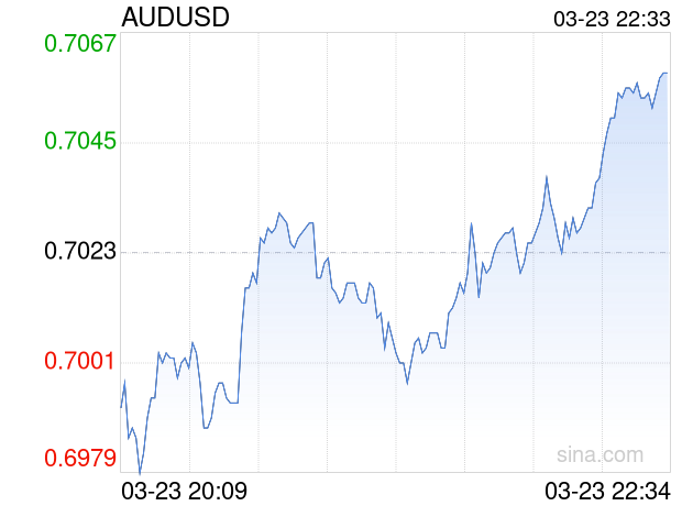 新浪外汇消息2026年03月23日,截至22时33分,外汇市场上澳元兑美元汇率突破1澳元兑换0.7059美元。涨幅为0.5126%