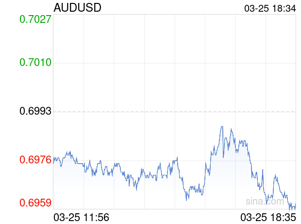 新浪外汇消息2026年03月25日,截至18时34分,外汇市场上澳元兑美元汇率跌破1澳元兑换0.6958美元。跌幅为-0.5005%