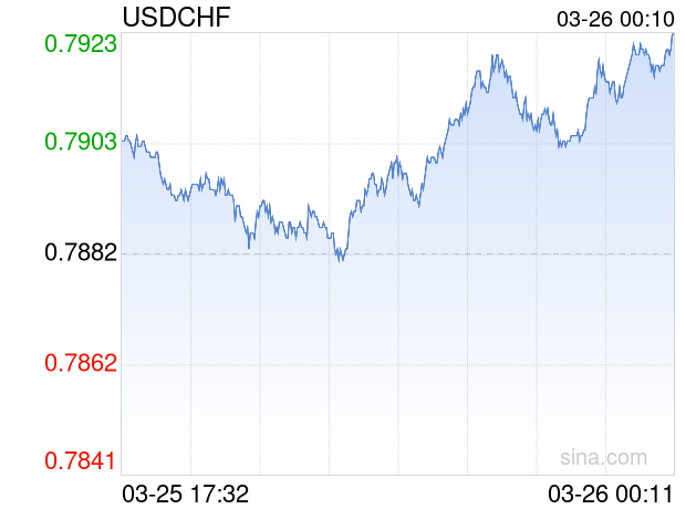 新浪外汇消息2026年03月26日,截至00时10分,外汇市场上美元兑瑞士法郎汇率突破1美元兑换0.7924瑞士法郎。涨幅为0.5329%