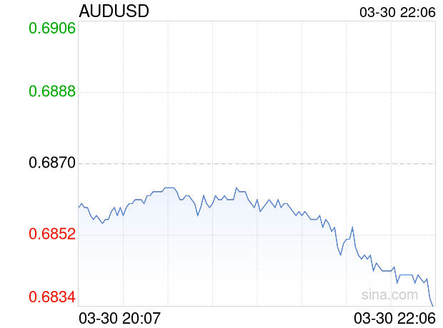 新浪外汇消息2026年03月30日,截至22时06分,外汇市场上澳元兑美元汇率跌破1澳元兑换0.6833美元。跌幅为-0.5386%
