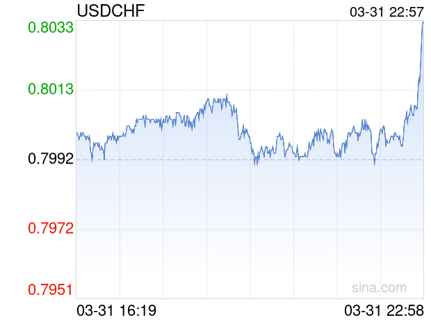 新浪外汇消息2026年03月31日,截至22时57分,外汇市场上美元兑瑞士法郎汇率突破1美元兑换0.8032瑞士法郎。涨幅为0.5005%
