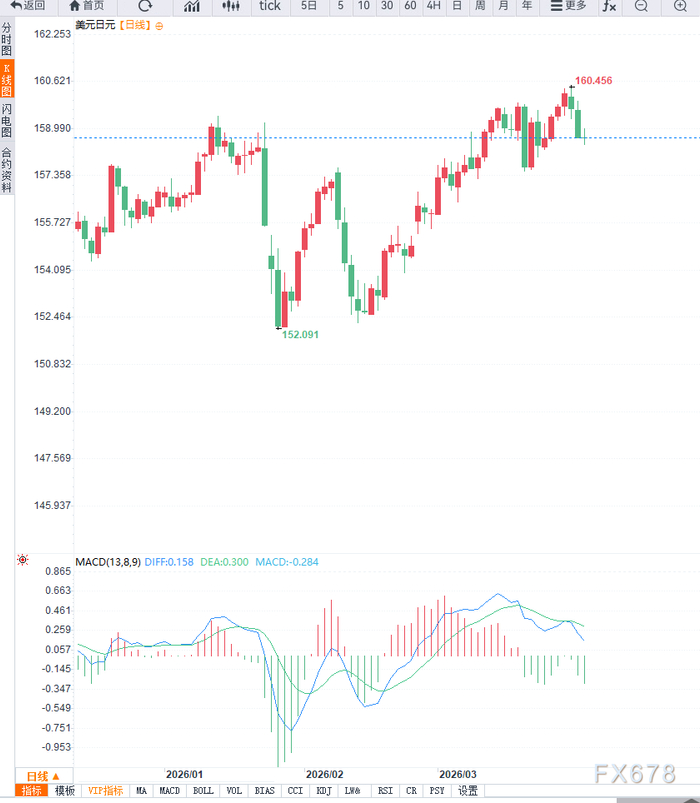 值得注意的是,市场普遍预期日本当局可能在必要时干预汇市以稳定日元,这在一定程度上抑制了美元兑日元的上行空间。政策干预预期成为重要上方压制因素。从技术面来看,日线级别USD/JPY处于高位震荡整理阶段,汇价多次在159-160区域受阻,显示上方存在较强抛压;下方158.00附近形成初步支撑,一旦跌破,可能进一步测试156区域。动能指标显示上涨趋势有所放缓,MACD逐步收敛,RSI回落至中性区间,表明多头动能减弱。