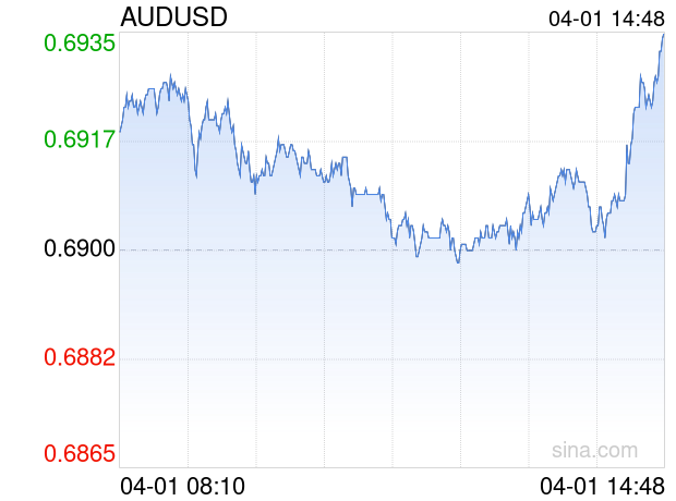 新浪外汇消息2026年04月01日,截至14时48分,外汇市场上澳元兑美元汇率突破1澳元兑换0.6936美元。涨幅为0.5217%