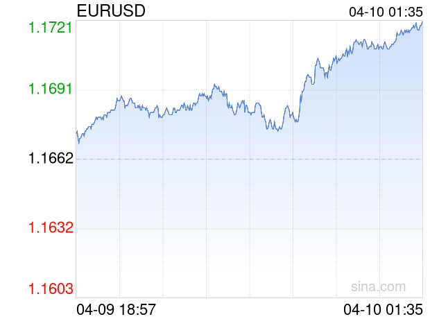 新浪外汇消息2026年04月10日,截至01时35分,外汇市场上欧元兑美元汇率突破1欧元兑换1.1721美元。涨幅为0.5059%