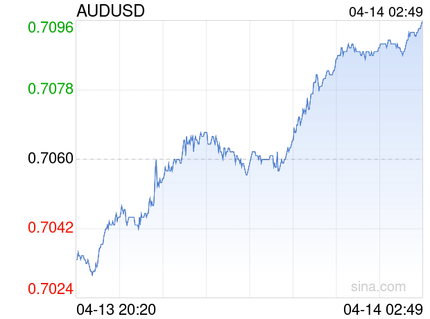 新浪外汇消息2026年04月14日,截至02时49分,外汇市场上澳元兑美元汇率突破1澳元兑换0.7096美元。涨幅为0.5099%