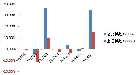 回溯2013年至2014年三季度以来,申万物流指数大部分时间跑赢上证指数。尤其是在2013年三季度和2014年三季度,申万物流指数的涨幅分别为35.87%和34.86%,分别大幅跑赢上证指数25.99%和19.45%。当大盘下跌时,比如2013年四季度和2014年一季度,上证指数分别下跌-2.7%和-3.91%时,申万物流指数分别上涨0.26%和3.42%。