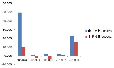 回溯2013年三季度至2014年三季度以来,电子商务指数都跑赢上证指数,并且电子商务指数每个季度都实现正收益。尤其在2013年三季度,电子商务指数涨幅为49.45%,大幅跑赢上证指数39.57%。当大盘下跌时,比如2013年四季度和2014年一季度,上证指数分别下跌-2.7%和-3.91%,电子商务分别上涨1.28%和2.27%。