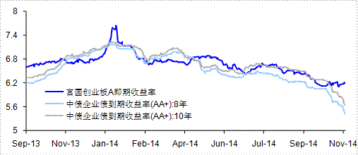 富国创业板A即期收益率与企业债到期收益率的比较(%)