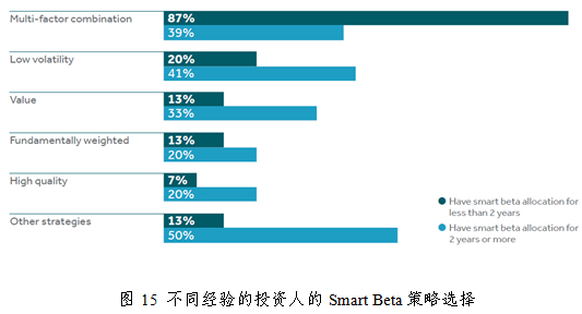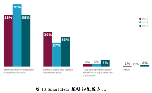在配置方式上,58%的机构使用Smart Beta 策略作为长期战略性投资工具,这一比例相比去年有所下降,与全球经济不确定性增加有关,此外33%同时作为长期战略与短期战术型投资工具,7%的机构仅仅作为战术型投资工具。