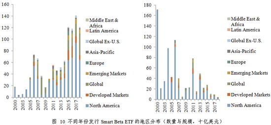 从历年发行的Smart Beta ETF地区分布来看,自2008年美国金融危机后,伴随全球化投资的兴起,发行商开始在全球与发达市场的Smart Beta ETF产品上进行布局。