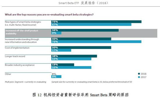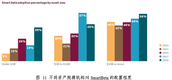 根据FTSE最新的《Smart beta:2018 global survey findings from asset owners》调查结果显示,全球资产机构对于Smart Beta投资方式的接受度进一步提升,由2017年的46%提升到2018年的48%,小型机构接受度的提升尤为明显。