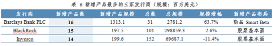 Smart Beta ETF的发行商中,前3大发行商产品规模占总体的70%,前5大发行商占90%的规模,而去年同期前10大发行商才占据90%的份额,市场集中度进一步提高,新晋发行商面临的挑战不断加大。