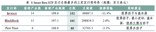 截至2018年末,共有84家ETF发行商布局过Smart Beta ETF,2018新增产品中,有16只产品来自11家新晋发行商,总规模仅为1.33亿美元。此外,BlackRock与Inveso这两个老牌发行商在去年仍发行较多产品,主要聚焦于股票基本面策略。